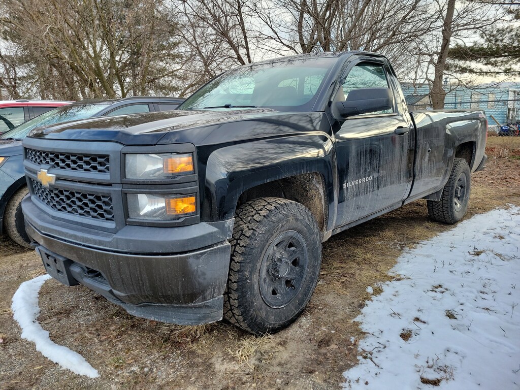 Tackle tough jobs with confidence in this 2014 Chevrolet Silverado 1500 4x4 Work Truck, Regular Cab with an 8 ft. long bed. Powered by the dependable EcoTec3 4.3L Flex Fuel V6 engine paired with a 6-speed shiftable automatic transmission and heavy-duty locking rear differential, this truck is ready for demanding tasks. The part-time 4WD system, front tow hooks, and full-size spare tire add peace of mind on worksites or off-road. Inside, stay comfortable with air conditioning, cruise control, and cloth upholstery. Modern features include a 4.2-inch infotainment screen, Bluetooth wireless connectivity, USB input, and SiriusXM satellite radio capability. Safety and convenience are covered with stability and traction control, trailer stability control, dual front and side curtain airbags, and keyless entry. The rugged 8-foot bed and steel wheels make it perfect for hauling, while chrome bumpers and a black grille deliver a sharp, professional look. Ready to work and built to last-schedule a test drive today!